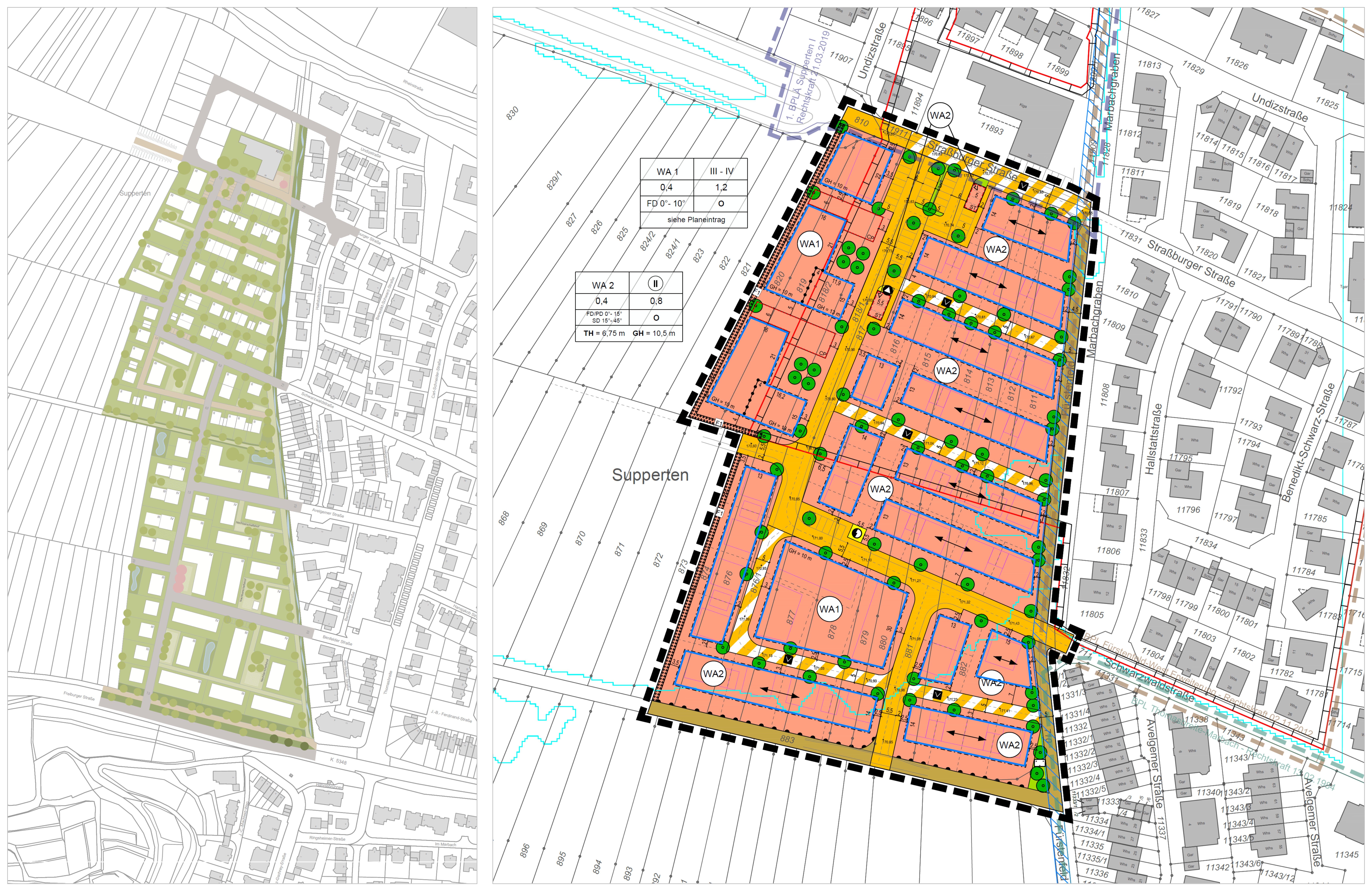 Städtebaulicher Entwurf (5,8 ha) mit Moderation eines Bürgerworkshops und Bebauungsplanaufstellung für den ersten Bauabschnitt (2,9 ha). Verdichtets Wohngebiet (ca. 160 Wohneinheiten) mit einem Mix unterschiedlicher Haustypen (ca. 80 Eigentumswohnungen). Herausforderungen stellten vorhandene Streuobstbestände, der archäologische Denkmalschutz und das 13b-Verfahren, was ein zusätzliches Heilungsverfahren erforderte. Auftrag Stadt Ettenheim.
